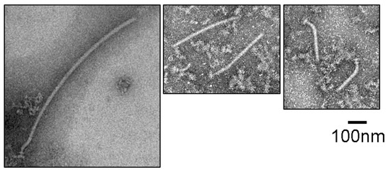 The hook–basal body complexes were purified according to the method described by Terashima et al. [29]. The IMV was solubilized by 0.1% (v/v) Triton X-100. The suspension was ultra-centrifuged at 150,000× g for 30 min. The filament–hook–basal body complex was precipitated and suspended in TET solution (10 mM Tris-HCl pH 8.0, 1 mM EDTA, 0.1% (v/v) Triton X100). In order to completely dissolve the membrane, the suspension was mixed with 1 mL of alkali solution (10% (w/v) sucrose, 0.1% (v/v) Triton X100, 0.1 M KCl, adjusted to pH 11.0 by KOH). The suspension was layered on 1 mL of 35% (w/v) sucrose solution prepared by dissolving sucrose in TET solution in an ultra-centrifuge tube. After incubation on ice for 30 min, the suspension was ultra-centrifuged at 38,000 rpm (Beckman TLA100.3 rotor) for 30 min to precipitate the filament–hook–basal body. The precipitates were suspended in TET solution and then observed by electron microscopy.