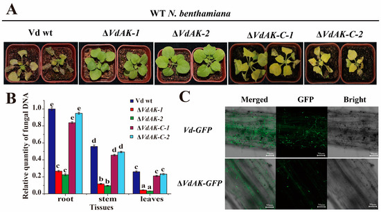 We further investigated the virulence of ΔVdAK, ΔVdAK-C, and wild-type Vd strains by inoculating 6-week-old seedlings of N. benthamiana with respective conidia. At 12 dpi, wilting symptoms and leaf necrosis were not visible on plants inoculated with ΔVdAK mutants, but symptoms were visible on plants inoculated with wild-type Vd (Figure 3A). The biomass of strain ΔVdAK was much lower in roots, stems, and leaves relative to that of the wild-type Vd (Figure 3B). Complementation strain ΔVdAK-C did not differ in virulence or biomass from the wild-type Vd (Figure 3A,B). Furthermore, hyphae of both Vd-GFP and ΔVdAK-GFP had colonized the roots by 5 dpi. Notably, spore germination was lower, and hyphae less abundant for the strain ΔVdAK-GFP than for Vd-GFP on the root surface (Figure 3C). In A. thaliana, strain ΔVdAK was less virulent and produced less biomass than did the wild-type and complementary strains, whereas the virulence of ΔVdAK-C and the wild-type Vd were equivalent (Figure S3A–C). Thus, these results confirmed that VdAK is indispensable for the full virulence of Vd.