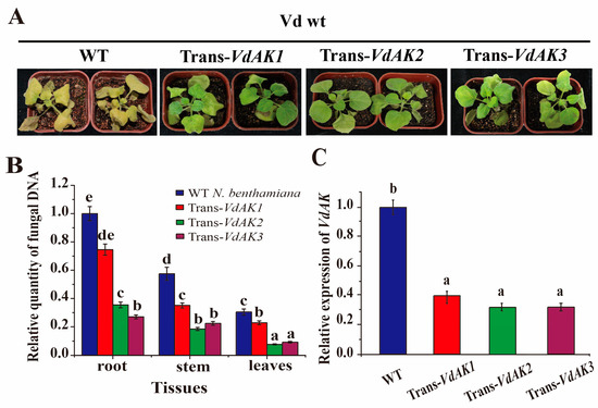 Expression of dsRNA of VdAK improved Vd resistance in N. benthamiana compared to wild-type plants (WT). WT and trans-VdAK plants were inoculated with wild-type Vd (Vd wt). (A) Symptoms on transgenic and wild-type plants at 12 days after roots were dipped in 106 spores/mL of the respective strains. (B) Relative amounts of fungal DNA as determined by RT-qPCR. (C) Transcript levels of VdAK in stems of transgenic and WT plants. Means (± SE) from three independent experiments that differed significantly among treatments in Duncan’s test (p <0.05) are indicated by different letters.