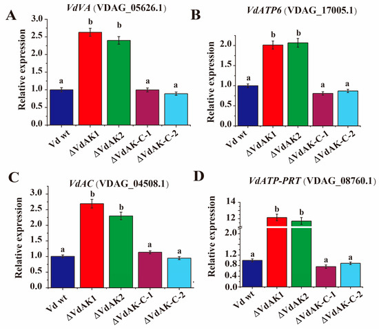Relative expression of fungal genes associated with energy metabolism in ΔVdAK, ΔVdAK-C, and wild-type Vd (Vd wt) strains. Strains were cultured in complete medium (CM) broth for 7 days. Transcript levels of VdVA (A), VdATP6 (B), VdAC (C), and VdATP-PRT (D). Mean (± SE) levels from three independent experiments that differed significantly in Duncan’s test (p <0.05) are indicated by different letters.