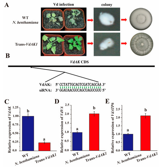 As a group of small, noncoding RNAs, siRNAs regulate post-transcriptional gene expression and participate in diverse biological processes, including resistance against stress [81,82,83,84]. In screening and study of a class of miRNAs related to Phytophthora sojae resistance in three soybean cultivars [85], the expression of miR393 in soybean significantly increases in response to P. sojae infection [86]. After Vd infection, cotton and A. thaliana increase the production of miRNA166 and miRNA159 to target Vd genes and result in improved resistance [87]. Five miRNAs in a highly resistant strain of Vitis davidii, revealed by microRNA sequencing, were specifically expressed and used to investigate further the potential inhibition of grape white rot disease caused by Coniella diplodiwlla [88]. In our study, a specific siRNA against VdAK was detected in Vd isolated from transgenic plants, which provides further insights into the action between siRNA and fungi in planta. VdAK was silenced due to the presence of siRNA, which results in the increased expression of VdVA and VdATP6 involved in energy metabolism. These results are consistent with the expression of the marker genes in ΔVdAK strains. The reduced wilt symptoms are likely caused by the disruption of energy metabolism of Vd and subsequent growth in transgenic seedlings. These results illustrate that the VdAK gene has potential as another target for a HIGS strategy to control Vd.