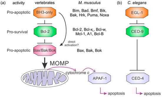 Our current understanding of intrinsic apoptosis is mainly derived from investigations of mouse, human, nematode (Caenorhabditis elegans), and fly (Drosophila melanogaster) apoptosis. These studies have shown the Bcl-2 family consists of two phylogenetically distinct groups of proteins: those that share the Bcl-2 fold [,] that are either prosurvival or proapoptotic and the proapoptotic intrinsically disordered ‘BH3-only’ proteins, that bear only the BH3 motif []. The BH3-only proteins are upregulated in response to diverse apoptotic stimuli [] and their principal role is to antagonize the prosurvival proteins [], but apoptosis also occurs in their absence []. Notwithstanding the conservation in the Bcl-2 family, there are substantial differences in Bcl-2-regulated apoptosis mechanisms. In mammals, there are nine multimotif Bcl-2 paralogs (six prosurvival Bcl-2, Bcl-xL, Bcl-w, Mcl-1, A1, Bcl-B, and three proapoptotic Bax, Bak, and Bok) and eight BH3-only proteins (Bim, Bad, Bmf, Bid, Bik, Noxa, Puma, Hrk) (Table 1) that regulate intrinsic apoptosis through a network of specific binding interactions that control the integrity of the MOM [] (Figure 1). A key step is Bax, Bak, or Bok oligomerization at the mitochondrial membrane that results in formation of membrane pores releasing cytochrome c to activate the caspase cascade. In contrast to mammals, MOM permeabilization (MOMP) and cytochrome c do not play a role in initiation of apoptosis in ecdysozoans C. elegans (Figure 1) or D. melanogaster [,,] (Figure 1). Combined, these results indicate the interactions of the Bcl-2 proteins have been maintained over the course of evolution.