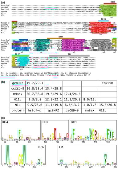 Sequence-structure analysis of Bcl-2 family members from sponges to man. (a) Structure-based sequence alignment of metazoan and viral Bcl-2 family members. Structurally equivalent residues are aligned. In (a), sequence–structure alignment shows prosurvival and proapoptotic Bcl-2 proteins share key sequence features. Sequences aligned: H. sapiens Bcl-xL; G. cydonium BHP2; C. elegans CED-9; Mus musculus Bax; Myxoma virus M11L; Vaccinia virus N1L. Sequence–structure alignment was performed using Dali [] and the secondary structure is indicated by the colored bars. The extent of the Bcl-2 homology (BH) motifs and transmembrane region (TM) is indicated by bars above the sequence and the helices below the sequences. (b) Table of sequence identities and similarities for the sequences in (a) given as percentage sequence identity/sequence similarity in each entry. Notably, the viral Bcl-2 proteins have little recognizable shared sequence identity with mammalian Bcl-2 proteins. (c) Profiles of BH and TM regions from Bax sequences representing bilaterians (Lepisosteus oculatis, Strongylocentrotus purpuratus, Ciona intestinalis), cnidarians (H. vulgaris, Acropora digitifera), placozoa (T. adhaerens), and porifera (A queenslandica). The height of each stack represents the conservation and the residue frequencies are represented by their height as determined by the program Skylign []. These indicate that the BH4 motif is a relatively weak and poorly conserved motif when compared to the BH1–BH3 motifs. Uniprot sequence and PDB IDs, hsBcl-xL: Q07817, 1R2D; gcBHP2: Q967D2, 5TWA; ceCED-9: P41958, 1OHU; mmBax: Q07813, 5W62; Myxoma virus M11L: Q77PA8, 2JBX; Vaccinia virus N1L: P21054, 2I39.