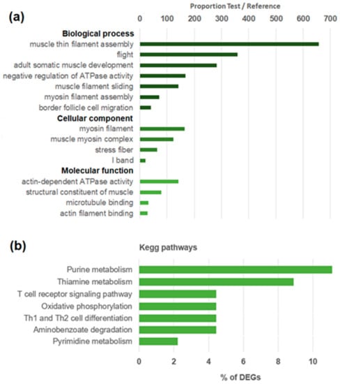 The RNA-seq analysis of stimulated hemocytes revealed 45 differentially expressed genes (DEGs)—39 up-regulated and 6 down-regulated—after a myticin C treatment (description and sequences available in the Supplementary File S1). Enriched GO terms after Fisher’s exact test showed that the most specific terms (Figure 1a) were related to the cytoskeleton and contraction, as well as maintenance of integrity of tissues and cell structures (“actin-dependent ATP-ase activity”, “microtubule binding”, or “actin filament binding”). Additionally, KEGG pathways were also represented (Figure 1b), with the pathways related to nucleic acid metabolism (purine and pyrimidine metabolism pathways) and vertebrate immune systems (“T cell receptor signaling pathway” and “Th1 and Th2 cell differentiation”) being the most represented.