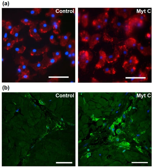 To observe the effect that myticin C exerts on hemocytes, these cells were exposed to the peptide and then stained with phalloidin (Figure 2a). The formation of actin structures that accumulate in cytoplasm and their numerous extensions to the outside of the cells were observed. These structures are reminiscent of podosomes, which are involved in cell mobility. Moreover, changes in actin levels were also observed in vivo after treating mussels with myticin C. An immunofluorescence assay on fixed adductor muscles was performed, and an increase in the actin levels after myticin C treatment could be observed (Figure 2b).