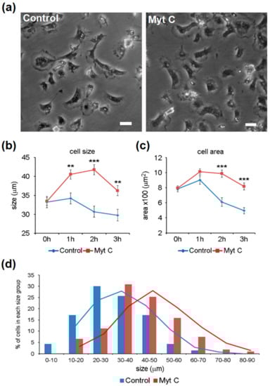 (a) Appearance of cells after 2 h of treatment with myticin C. Cell size analysis using (b) maximum length and (c) area measurements. Asterisks indicates significant differences at p < 0.01 (**) and p < 0.001 (***). (d) Distribution of cells in different size groups after 3 h of stimulation.