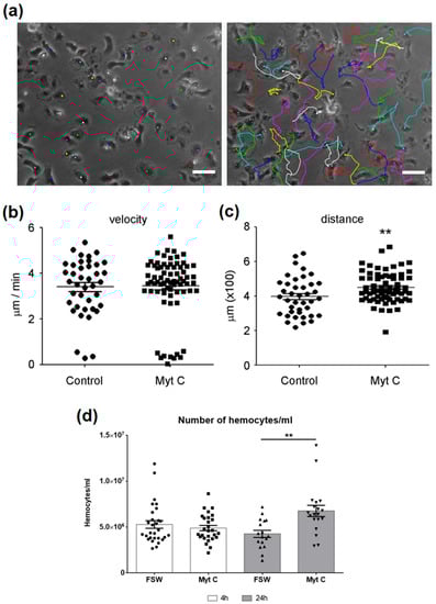 (a) Tracking of individual cell movements. The displacement of single cells is marked with a different color. Scale bar 50 µm. (b) Mean velocity of cell displacement (µm/min) after 3 h of stimulation. (c) Accumulated distance traveled by the cells during 3 h. (d) Number of hemocytes counted after 4 h and 24 h of in vivo treatment with myticin C. Asterisks denote significant differences at p < 0.01 (**).