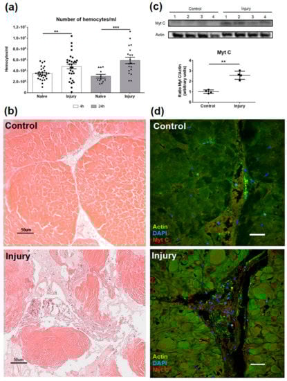 (a) Number of hemocytes in mussel muscle 4 h and 24 h after an injury. Asterisks indicate significant differences at p < 0.01 (**) and p < 0.001 (***). (b) Histological sections of healthy or injured adductor muscle using hematoxylin and eosin (HE) staining. Note the increase in the number of hemocytes in the damaged area. (c) Western blot of myticin C in samples of hemocytes extracted from naïve and injured mussels. Asterisks indicates significant differences at p < 0.01 (**). (d) Immunofluorescence of muscle sections of healthy or injured muscles. Triple labeling of actin (green), myticin C (red), and 4′,6-diamidino-2-phenylindole (DAPI) (blue). Bar scale represents 25 μm.