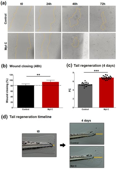 An in vivo test using WT zebrafish larvae was performed. The larvae tail fin was amputated, and after treatment with myticin C, the regeneration was followed for seven days. A significant increase of tail regeneration was observed after the second day, reaching the maximum at day 4 (Figure 6c). The measures were performed as Figure 6d illustrates.