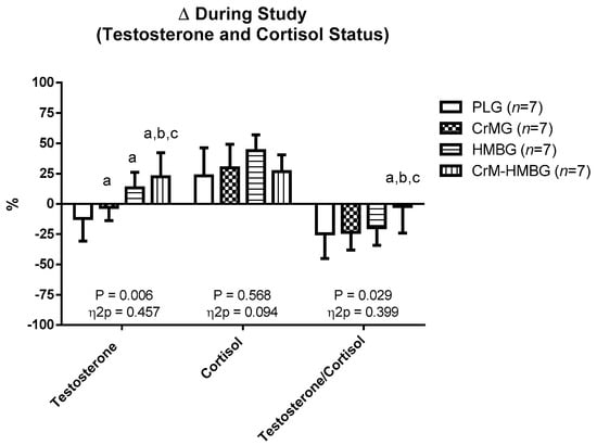 Percentage changes during the study in cortisol and testosterone hormone status and testosterone/cortisol ratio in the four study groups. Data are expressed as mean ± standard error. Δ: ((T2 − T1)/T1) × 100; differences among groups in each test by ANOVA test (p < 0.05): a: regarding PLG; b: regarding CrMG; c: regarding HMBG.