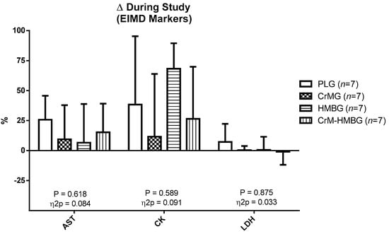 EIMD markers (AST, LDH, and CK) did not present statistically significant differences in the group-by-time interaction between T1 and T2 (Table 4). However, significant increases between T1 and T2 were observed for AST in PLG (T1: 17.83 ± 2.79 vs. T2: 22.00 ± 1.55).