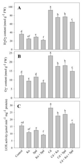 The application of Kn and Spd considerably declined the accumulation of ROS, including H2O2 and O2 under Cd stress. Earlier, Ahmad et al. [1] and Ahanger et al. [8] have also reported increased ROS accumulation in Cd and salinity-stressed plants. The earlier application of Kn [7] and putrescine [53] to Cd-stressed tomatoes and mungbeans have been reported to reduce the accumulation of H2O2 and O2−. However, their accumulation under the combined application of Kn and Spd has not been reported. Excess H2O2 and O2− can hamper key cellular processes such as photosynthesis by reducing the stability of organelle structures. An excess accumulation of H2O2 and O2− under stress leads to increased damage to proteins and lipids, thereby affecting their integrity and functioning, which was also apparent in the present study as increased lipid peroxidation and electrolyte leakage. Cd stress-mediated enhancement in the ROS accumulation results in the activation of lipoxygenase, which is an indicator of greater damage to lipids. In the present study, lipoxygenase activity was reduced by the exogenous application of Kn and Spd. Nahar et al. [53] have also reported reduced lipoxygenase activity due to putrescine application under Cd stress. Lipoxygenase generates unsaturated fatty acid hydroperoxide by adding molecular oxygen to polyunsaturated fatty acids and can also produce excess acyclic or cyclic compounds due to fatty acid oxidation [65]. Such increased membrane stability due to the combined application of Kn and Spd may be due to the maintenance of increased antioxidant activity in them.