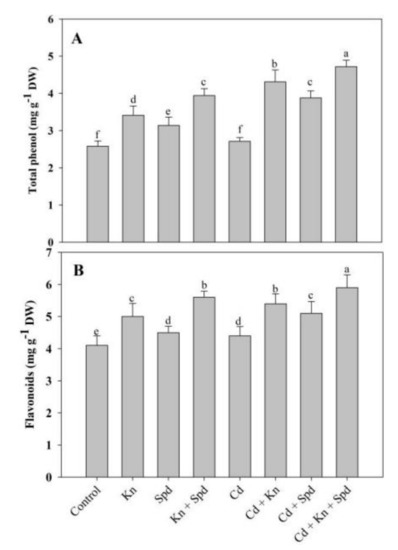 The application of Kn and/or Spd increased the accumulation of phenols and flavonoids significantly, attaining a maximal increase of 34% and 26% in seedlings treated with Kn + Spd over the control. Relative to control, Cd stress induced a slight accumulation of phenols (4%) and flavonoids (6%); however, the application of Kn or Spd individually further enhanced their accumulation. Relative to Cd-stressed plants, Cd + Kn + Spd-treated plants exhibited a further increase of 42% and 25% for phenols and flavonoids, respectively (Figure 7).