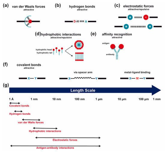 Forces involved in biomolecules immobilization onto natural fibers. (a) van der Waals forces; (b) hydrogen bonds between a H-bond donor and a H-bond acceptor; (c) electrostatic interactions between oppositely, or likely, charged species; (d) hydrophobic effects (here represented in the form of micelles or bilayers); (e) example of affinity recognitions, such as an antigen–antibody interaction; (f) covalent bond between donors X and Y without a spacer arm (left), via a spacer arm (middle) and metal–ligand binding between a soluble metal acceptor center (M) and organic ligand donors (X and Y) (right); and (g) length scales of the forces involved, taking into account that hydrophobic interactions occur upon contact, and that antigens are bound to antibodies through electrostatic interactions, hydrogen bonds, van der Waals forces and hydrophobic interactions [180,181,185,186,187,188,189,199,200].