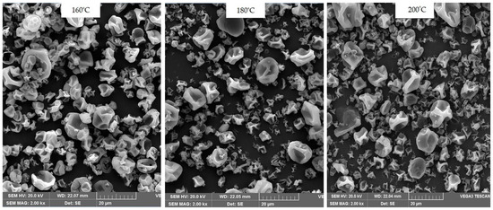 The surface morphology of the powders was observed and acquired using a scanning electron microscope (Vega 3 LMU, Tescan, Brno, Czech Republic). The samples were directly deposited on aluminium stubs using a double-sided adhesive carbon conductive tape and coated with a thin cold layer with the help of gold sputter. An accelerating potential of 15 kV was used during microscopic observation.