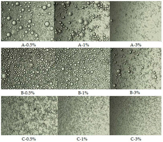 Optical microscopic images of emulsions prepared with FOCE powders obtained at various temperatures; A—emulsions prepared with powder obtained at 160 °C; B—emulsions prepared with powder obtained at 180 °C; C—emulsions prepared with powder obtained at 200 °C; and 0.5%, 1%, and 3%—powder contents.