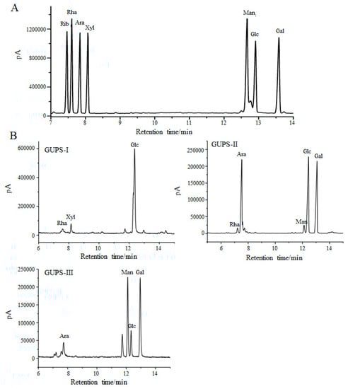The monosaccharide composition of GUPS-I, GUPS-II, and GUPS-III was analyzed by GC-MS and compared with monosaccharide standards. The results showed that GUPS-I was composed of Rha, Xyl, and Glc at molar ratios of 2.55:1.9:30.03, GUPS-II consisted of Rha, Ara, Man, Glc, and Gal at molar ratios of 1:13.87:1.59:16.76:15.72, and GUPS-III was composed of Ara, Man, Glc, and Gal at molar ratios of 1:5.33:1.91:5.97 (Figure 2). The monosaccharide composition of GUPS-II was similar to that determined in previous studies, but GUPS-III had some differences, such as the mannose content [,].
