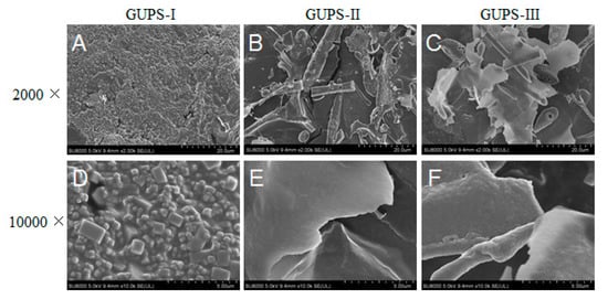 SEM images of GUPS-I, GUPS-II and GUPS-III. The magnifications of (A–C) and (D–F) are 2000× and 10,000×.