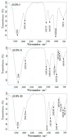FT-IR spectra of GUPS-I, GUPS-II, and GUPS-III.