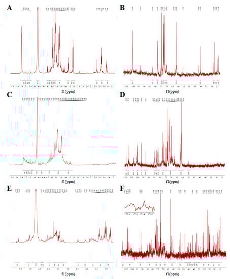 One-dimensional NMR spectra of GUPS. (A) 1H NMR spectrum of GUPS-I; (B) 13C NMR spectrum of GUPS-I; (C) 1H NMR spectrum of GUPS-II; (D) 13C NMR spectrum of GUPS-II; (E) 1H NMR spectrum of GUPS-III; (F) 13C NMR spectrum of GUPS-III.