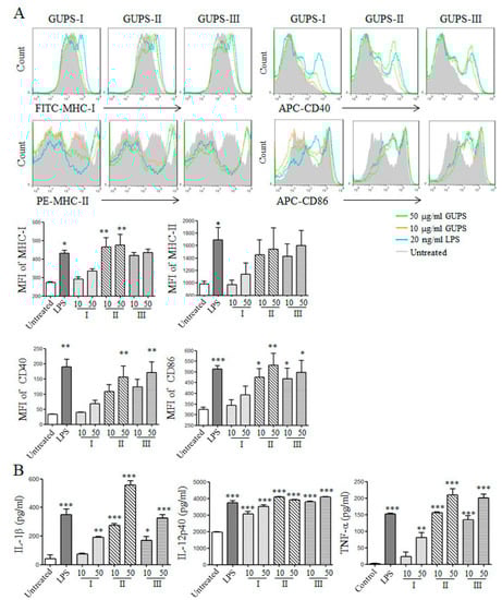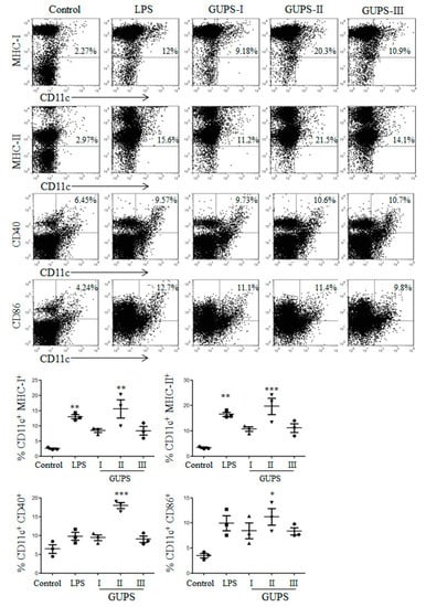 Dendritic cells were generated from bone marrow cells of C57BL/6 mice in the presence of GM-CSF following a previously-described protocol []. On day 7, DCs were harvested and treated with different concentrations (10, 50 μg/mL) of GUPS for 12 h. LPS (20 ng/mL) were used as the positive control.