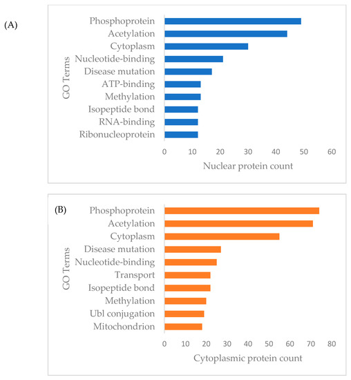For the functional categories of differentially expressed cytoplasmic and nuclear proteins of MDA-MB-231 cells in response to γT3 treatment, the analysis revealed that most of these proteins were grouped under phosphoprotein, acetylation, and cytoplasm (Figure 2). Interestingly, there were a total of 74 differently expressed cytoplasmic proteins of MDA-MB-231 categorized as phosphoproteins, based on the DAVID analysis and these proteins might mediate γT3 induced post-translational modification. As for the functional categories of differentially expressed MDA-MB-231 nuclear proteins in response to the γT3 treatment, the analysis showed that most of these proteins are grouped under acetylation, nucleotide binding, ribonucleic, and transport proteins, which confirmed the nature of nuclear fraction used in this study (Figure 3). Interestingly, there were a total of 49 differentially expressed nuclear proteins of MDA-MB-231 categorized as phosphoproteins, based on the DAVID analysis and these proteins might mediate γT3 induced post-translational modification.