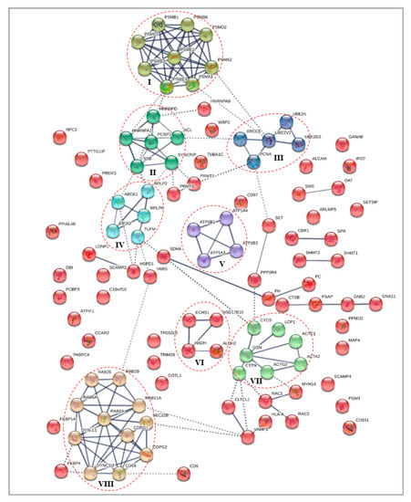 For differentially expressed cytoplasmic proteins of MDA-MB-231 cells in response to γT3 treatment, the PPI network generated a total of 154 edges, among which 98 edges with high confidence generated a significant (p < 9.84 × 10−8) PPI enrichment clusters with a local clustering coefficient of 0.466 (Figure 3). A total of eight clusters were generated using K-means clustering, in which prominent interactions of cluster I was formed with PSMB1, PSMB6, PSMD2, PSMA2, PSMA1, PSME3, PSMB7, PSMD7, and PSME3; cluster II with HNRNPD, HNRNPA1, SSB, SYNCRIP, NCL, and PCBP2; cluster III with XRCC6, PCNA, UBE2V2, UBE2K, and UBE2D3; cluster IV with EIF3G, TUFM, RPLP0, RPLP2, and ABCE1; cluster V with ATP1B1, ATP1A3, ATP1B3, and ATP1B3; cluster VI with ECHS1, HSD17B10, HADH, and ALDH2; cluster VII with CYCS, LCP1, ACTC1, ACTA2, ACTG2, CTTN, and GSN; and cluster VIII with RAB25, RAB2B, RAB11A, SEC22B, COPG1, COPG2, CD59, DYNC1I2, DYNLL1, RAB1A, and RAB6A.