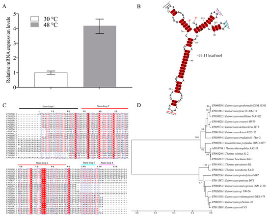 Figure 1. Secondary structure, multi-sequence alignment, and phylogenetic analysis of dsr11. (A) The expression of dsr11 under heat stress in D. radiodurans wild-type (WT) by qRT-PCR. (B) dsr11 consisted of four stem-loop structures with free energy of −33.11 kcal/mol, and the stem-loops were numbered. (C) The multi-sequence alignment was performed using Clustal X2 and then manually refined. The sequences were divided into four clusters. The sequences of stem-loop 2 were highly similar to other homologs. (D) The guide tree reflects the similarity relations between the homologous sequences in the form of hierarchical clustering. It is constructed by the UPGMA method by MEGA 7.0.