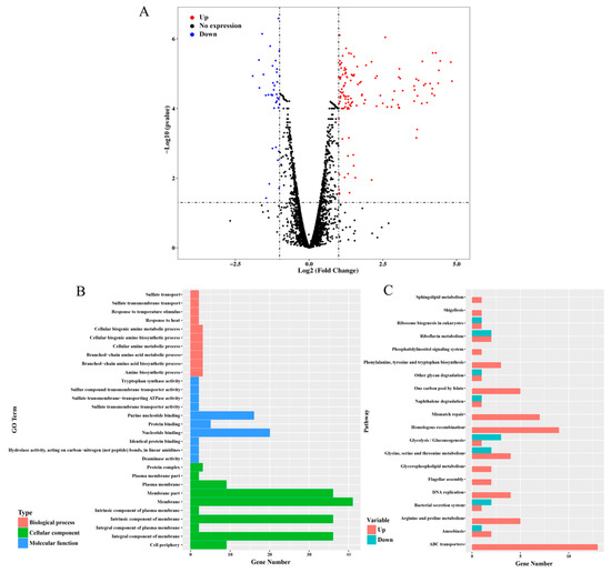 Figure 3. RNA-seq analysis between WT and ∆Dsr11. (A) Volcano map of the differential expression genes ∆Dsr11 versus WT. Each point represents a unigene. The red and blue points indicate significant changes in the absolute value of log2 (fold change) ≥ 1 and FDR ≤ 0.05, respectively; i.e., the red points indicate up-regulated unigenes, and the blue points indicate down-regulated unigenes in the two groups, with the differential expression levels presented along the X-axis. The black points indicate nonsignificant, differentially expressed unigenes (B) GO terms with significant enrichment analysis of differentially expressed genes in ∆Dsr11 compared to WT. (C) Top 20 KEGG biological pathway classification histograms for annotated unigenes.