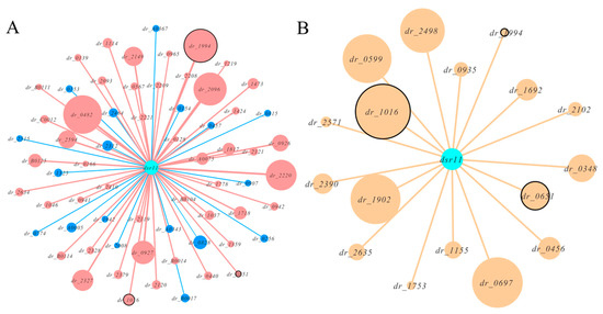 Figure 4. Network plots of dsr11 and target interactions by RNA-seq and in silico prediction. All hypothetical genes were eliminated. (A)The effect of dsr11 knockout on gene expression by RNA-seq. Red nodes represent up-regulated genes and blue nodes represents down-regulated genes. The size of the node represents the expression. The common genes as in silico predicted are marked with black circles. (B) The predicted targets of dsr11 by TargetRNA2. The size of the node represents the binding strength based on the thermodynamic energy of hybridization. The common genes as RNA-seq analysis are marked with black circles.