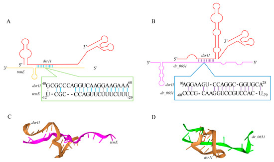 Figure 5. Predicted interaction sites of dsr11 and target genes. (A,B) Schematization of the interaction between dsr11 and two target mRNAs based on TargetRNA2. (C,D) The tri-dimensional interaction model was predicted by HNADOCK [46].