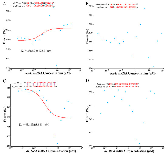 Figure 6. Determination of the binding affinity of dsr11 to target mRNAs by microscale thermophoresis (MST). Red bases mean complementary bases in the binding sequence, the red curve is the fitted combination curve, and the Kd (dissociation equilibrium constant) value is the binding constant of dsr11 and their targets. (A,C) are the binding of trmE mRNA and dr_0651 mRNA, respectively, with dsr11-wt. (B,D) are the binding of trmE mRNA and dr_0651 mRNA, respectively, with dsr11-mut.