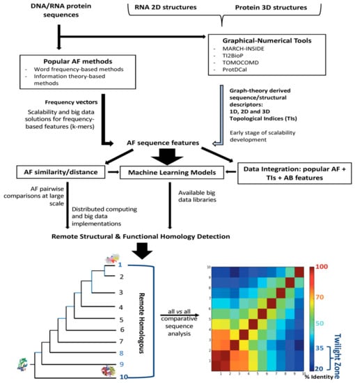 Graphical–numerical approaches have been applied to encode the structure of DNA, RNA, and proteins for functional annotation with no alignments [,,], for the prediction of the stability of Arc repressors [,], the interaction between drug receptor [,], and detection of protein biomarkers in human diseases []. However, the potentialities of such approaches to overcome some bioinformatics’ handicaps like the detection of remote homologs in the twilight zone have not been fully explored and that is probably the reason why they are not considered among the AF methods reviewed in recent reviews [,].