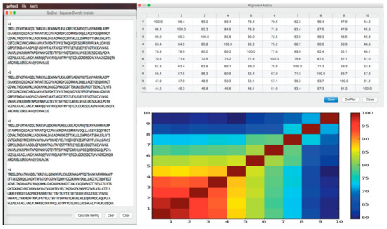 Here, we present SeqDivA, a Python-based tool with a friendly GUI allowing non-expert users to run alignment algorithms (water, needle, and blast) to compare all-vs.-all protein, DNA, and RNA sequences (Figure 2). SeqDivA provides similarity, identity, and bit-score matrixes to explore the diversity/homology of the sequences, enabling the delimitation of the twilight zone. The resulting matrixes are visualized using dot plot-like graphs representing pairwise similarity measures (identities, similarity, and bit scores). SeqDivA also allows redundancy reduction by exploring amino acid identities from global alignments and can be connected to the output of software simulating related sequences with a known evolutionary history, i.e., ROSE - Random Model of Sequence Evolution [] and INDELible—Insertions and Deletions simulations [], in order to get subsets of homologous sequences at different identities or bit-scores ranges. The SeqDivA software can be freely downloaded at https://github.com/eancedeg/SeqDivA. It has been previously used to evaluate the pairwise similarity/identity of hundreds of adenylation domains and thousands of enzyme and non-enzyme protein structures (all vs. all) to identify the twilight zone [,].