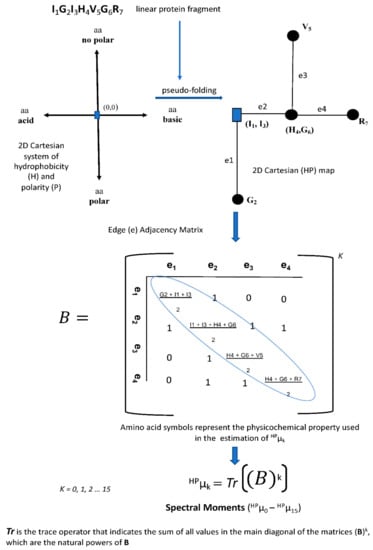 The workflow previously-shown in the Figure 4 illustrates how spectral moments are estimated as TIs for the protein fragment “IGIHVGR” pseudo-folded into the 2D-Cartesian system of hydrophobicity and polarity by the TI2BioP methodology [].