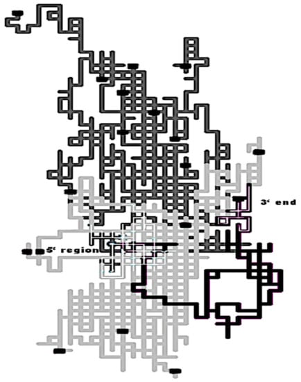 More recently, graph theory has been extended to characterize DNA and protein structures for performing comparative analysis with no alignments. Long and complex biopolymers can be simplified into 2D and 3D artificial representations of their structures. Such 2D and 3D graphs do not represent the real structure of DNA, RNA, and proteins but are expected to be useful for exploring pairwise similarities and differences by extracting hidden patterns of the underlying sequences [,]. The 2D artificial representations have been more widespread due to their relative simplicity for qualitative (visual) inspection (Figure 3) and for deriving numerical descriptors from topological distance matrixes representing the 2D graphs [,,] (Figure 4).