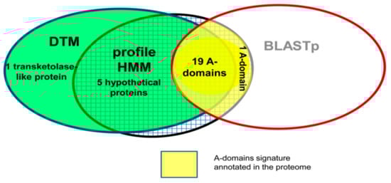 Additionally, the DTM was applied in cooperation to AB algorithms (multi-template BLASTp and HMMs) to fully re-explore A-domain signatures in the proteome of the cyanobacteria Microcystis aeruginosa NIES-843 (Figure 7). Putative A-domain remote homologs were commonly detected by the profile-based methods (DTM and HMMs) among the hypothetical proteins (green squared area of Figure 7) while the 20 annotated A-domains in the proteome of Microcystis aeruginosa were commonly detected by two methods (HMM and multi-template BLAST). Look at the common yellow area of Figure 7 to see that just DTM misclassified one hit. Nonetheless, the multi-template BLASTp could not detect additional A-domain signals.