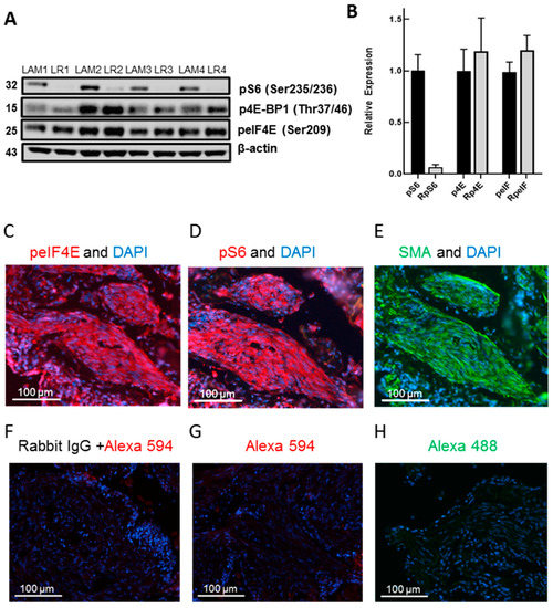 Other researchers have shown the expression of pS6 and p4E-BP1 in LAM lung tissue [21]. We showed here, for the first time, that LAM lung lesions express peIF4E (Ser209) (Figure 2C). peIF4E was particularly abundant in spindle cells within LAM lesions (Figure 2D). peIF4E was co-expressed with pS6 and α-smooth muscle actin in LAM lesions (Figure 2E,F). As a control for non-specific immunofluorescence, we showed this area of the LAM lesion with the IgG control antibody that showed no specific staining (Figure 2G). In normal lungs, we also observed phosphorylated eIF4E but the immunofluorescent signal appeared to be less intense than in LAM lesions (data not shown).