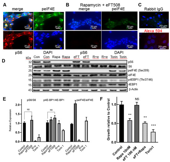 MNK1/2 inhibitor eFT508 inhibits peIF4E but not growth in TSC2-null LAM patient-derived angiomyolipoma cells. (A) Immunofluorescent analysis of LAM patient-derived AML 621-102 cells. (A) Merge (yellow) of pS6 (Ser235/236) (red) and peIF4E (Ser209) (green), peIF4E alone (green), pS6 alone (red), and 2-(4-amidinophenyl)-1H-indole-6-carboxamidine (DAPI) DNA-stained blue nuclei. All are rabbit primary antibodies. (B) Pretreatment of 621-102 cells with Rapamycin (10 nM), plus eFT508 (1 μM) peIF4E (green), pS6 (red), and DAPI (blue). (C) Control anti-rabbit IgG Alexa 488 and Alexa 594. (D) Immunoblot detection of pS6, S6, peIF4E, eIF4E, p4E-BP1, 4E-BP1, and β-Actin in 621-102 cells incubated for 16–18 h in a serum-deprived medium. The immunoblot represents data from three independent experiments with duplicate or triplicate samples. (E) Expression of pS6/S6, p4E-BP1/4E-BP1, and peIF4E/eIF4E corrected for β-Actin expression in each lane and relative to the appropriate control, set as one. Error was calculated +/− S.E.M and NS = Non-significant. (F) Growth inhibition of 621-102 cells, incubated in a medium containing 2.5% serum in 96 wells for 48 h, by rapamycin (10 nM) (Rapa) and Torin (500 nM), but not by eFT508 (100 nM) (eFT) and in combination (R + e). Cell growth was determined as described in Materials and Methods. Control growth absorbance 590 was set as one and drug inhibition was graphed relative to control. Graph F is representative of 4 independent studies in quadruplicate. Error was calculated +/− SD and significance relative to control is shown as ** p < 0.01; *** p < 0.001 or NS—non-significant.