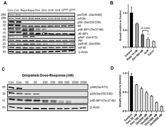 3.3. PI3K/mTOR Inhibitor Omipalisib Inhibits pS6, p4EB-P1, pAkt, and Cell Growth