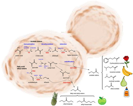 Metabolic pathways involved in the formation of floral and fruity esters in yeasts. Production of acetate esters by Ehrlich catabolism of amino acids and production of fatty acids ethyl esters (TA: transaminase, KDC: 2-keto acid decarboxylase, ADH: alcohol dehydrogenase, Atf: acyltransferase). Formation of fatty acid ethyl esters by acylation with acyl-CoA (PDC: pyruvate decarboxylase, ADH: alcohol dehydrogenase, Eeb1/Eht1: ethyl ester biosynthesis/ethanol hexanoyl transferase).