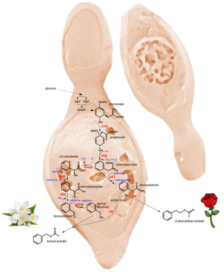 Metabolic pathways involved in the de novo synthesis from sugars of floral esters by H. vineae following the chorismate-prephenate-(S)-mandelate/phenylalanine pathway (ChM: chorismate mutase, PrD: prephenate dehydratase, hmaS: hydroxymandelate synthase, hmO: hydroxymandelate oxidase, bDC: benzoylformate decarboxylase, aDH: benzyl alcohol dehydrogenase; aAT: aromatic aminotransferase; Atf: acyltransferase). Adapted from [36,38,39].
