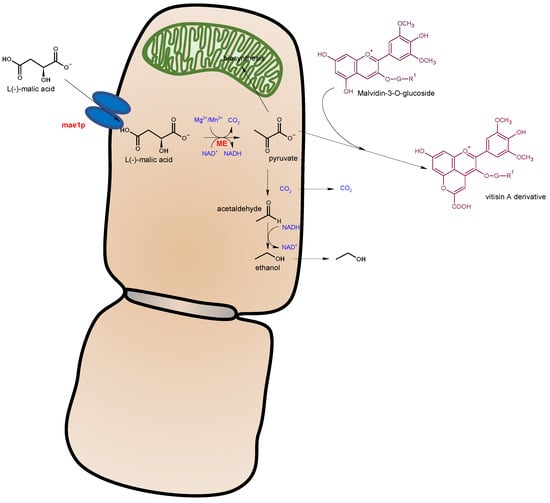 Maloalcoholic fermentation (MAF) produces the metabolisation of malic acid into ethanol. The malic enzyme (ME) of S. pombe has 15-folds higher affinity by malic acid than the ME of S. cerevisiae [61]. This higher efficiency is due to the presence of the specific malate permease transporter in S. pombe (mae1p) facilitating the entrance of malate into the cytosolic media, and also because the ME is located in the cytosol conversely to S. cerevisiae in which this pathway is produced in the mitochondrion [61]. MAF of S. pombe increases the release of extracellular pyruvate facilitating the formation of stable vitisin A-type derivatives [62] by chemical condensation with grape anthocyanins [17] (Figure 4). The higher the extracellular release of pyruvate, the higher the formation of stable pyranoanthocyanins. Pyranoanthocyanins are more stable pigments under oenological conditions not only because of their lower sensibility to SO2 bleaching, but also to their lesser hypochromic pH effect [63].