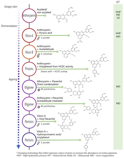 In the same way that yeast strains promote the formation of pigments, emerging preservation technologies for grape berries/must processing and winemaking could improve the colour in wines (Figure 5). Such is the case of the high hydrostatic pressure (HHP) that increases total anthocyanins extraction and the formation of pyranoanthocyanins [73], especially the amount of vitisin A; the use of pulsed electric fields (PEF) or the ultrasounds (US) that have shown to produce an increase in anthocyanin extraction from cell wall structures after suffering membrane disruption [74,75]; the micro-oxygenation (MO) could also have an impact in the colour of red wines through the formation of vitisins or direct condensation of anthocyanin and tannins where oxygen and reactive species may play an important role [76].