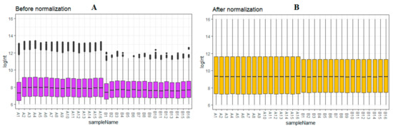 - Carvalho, B.S.; Irizarry, R.A. A framework for oligonucleotide microarray preprocessing. Bioinformatics 2010, 6, 2363–2367. [Google Scholar] [CrossRef]