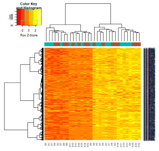 Heat map of down regulated differentially expressed genes. Legend on the top left indicate log fold change of genes. (A1, A2, A3, A4, A5, A6, A7, A8, A9, A10, A11, A12, A13, A14, A15, A16 = male human CAD samples; B1, B2, B3, B4, B5, B6, B7, B8, B9, B10, B11, B12, B13, B14, B15, B16 = female human CAD samples).