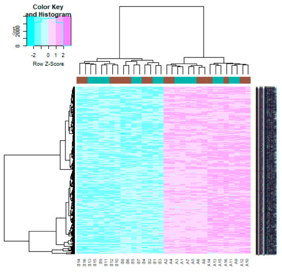 After quality control, normalization and batch effect adjustment, gene expression profiles from CAD samples with male and female were compared. The boxplot proved good normalization of the GSE23766 data (Figure 2A,B). A total of 894 significant DEGs (adjusted p-value < 0.05, |log2(Fold Change)| > 0.1694 for up regulated genes, |log2(Fold Change)| > 0.229 for down regulated genes), including 456 up regulated and 438 down regulated genes, were identified from GSE23766 dataset (Table S1). The volcano plot of each gene expression profile data was shown in Figure 3. Hierarchical clustering analysis showed the expression pattern of DEGs among samples, which suggested that the expression of genes in CAD with male significantly differ from those in adjacent CAD with female (Figure 4 and Figure 5).