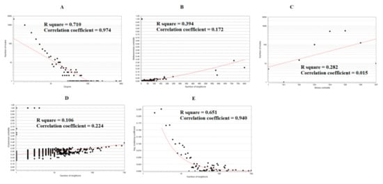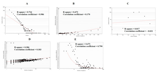 Regression diagrams for down regulated genes (A) Node degree; (B) Betweenness centrality; (C) Stress centrality; (D) Closeness centrality; (E) Clustering coefficient.