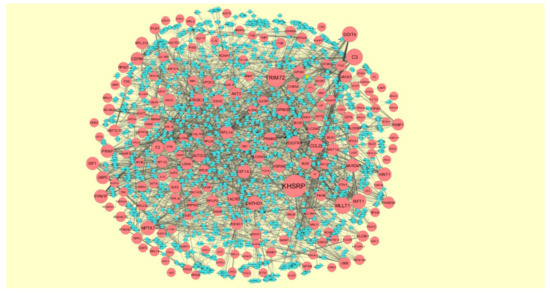 MicroRNAs (miRNAs) expressions were responsible for progression of CAD [54]. The miRNAs that may control the up and down regulated target genes are shown in Figure 12 and Figure 13. Top five up regulated target genes such as TAOK1 interacts with 222 miRNAs (ex, hsa-mir-3941), HMGB1 interacts with 143 miRNAs (ex, hsa-mir-1183), ZNF708 interacts with 104 miRNAs (ex, hsa-mir-6832-5p), MYC interacts with 103 miRNAs (ex, hsa-mir-4662b) and ZNF101 interacts with 91 miRNAs (ex, hsa-mir-3187-3p) are listed in Table S7. Top five down regulated target genes such as KHSRP interacts with 178 miRNAs (ex, hsa-mir-548ac), TRIM72 interacts with 123 miRNAs (ex, hsa-mir-6890-3p), MLLT1 interacts with 95 miRNAs (ex, hsa-mir-5681a), C3 interacts with 93 miRNAs (ex, hsa-mir-3135b) and DDIT4 interacts with 82 miRNAs (ex, hsa-mir-3607-3p) are listed in Table S7.