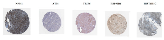 Validation of the hub genes (up regulated) with immunohistochemistry from HPA database. Hub genes NPM1, ATM, TRIP6, HSP90B1 and HIST1H1C were high expressed in CAD.